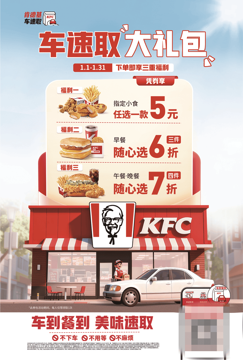 此外,肯德基车速取新年活动也即将上线:1月1日至1月31日,下单享三重福利,包括指定小食5元、早餐6折、午晚餐7折四件。微信支付用户还可领29元减5元券,在小程序下单使用。活动期内每日可领,车到餐到,方便快捷。